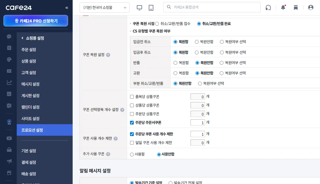 경로: [관리자 화면 → 쇼핑몰 설정 → 프로모션 설정 → 쿠폰 기본설정]