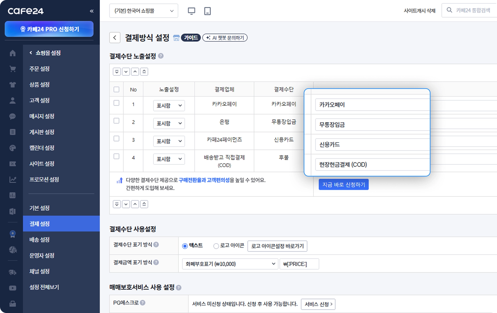 경로 : [관리자 화면 → 쇼핑몰 설정 → 결제 설정 → 결제방식 설정]