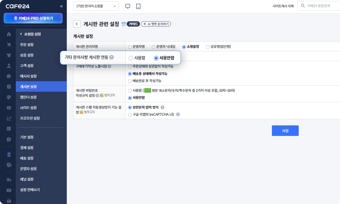 경로 : [관리자 화면 → 쇼핑몰 설정 → 게시판 설정 → 게시판 관련 설정]