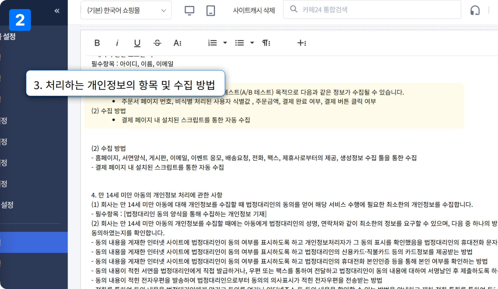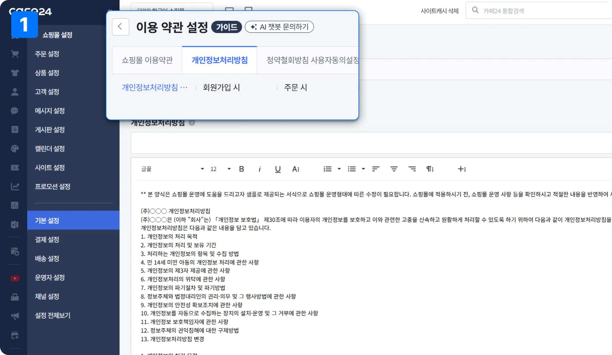1. 카페24 관리자 → 개인정보처리방침 변경