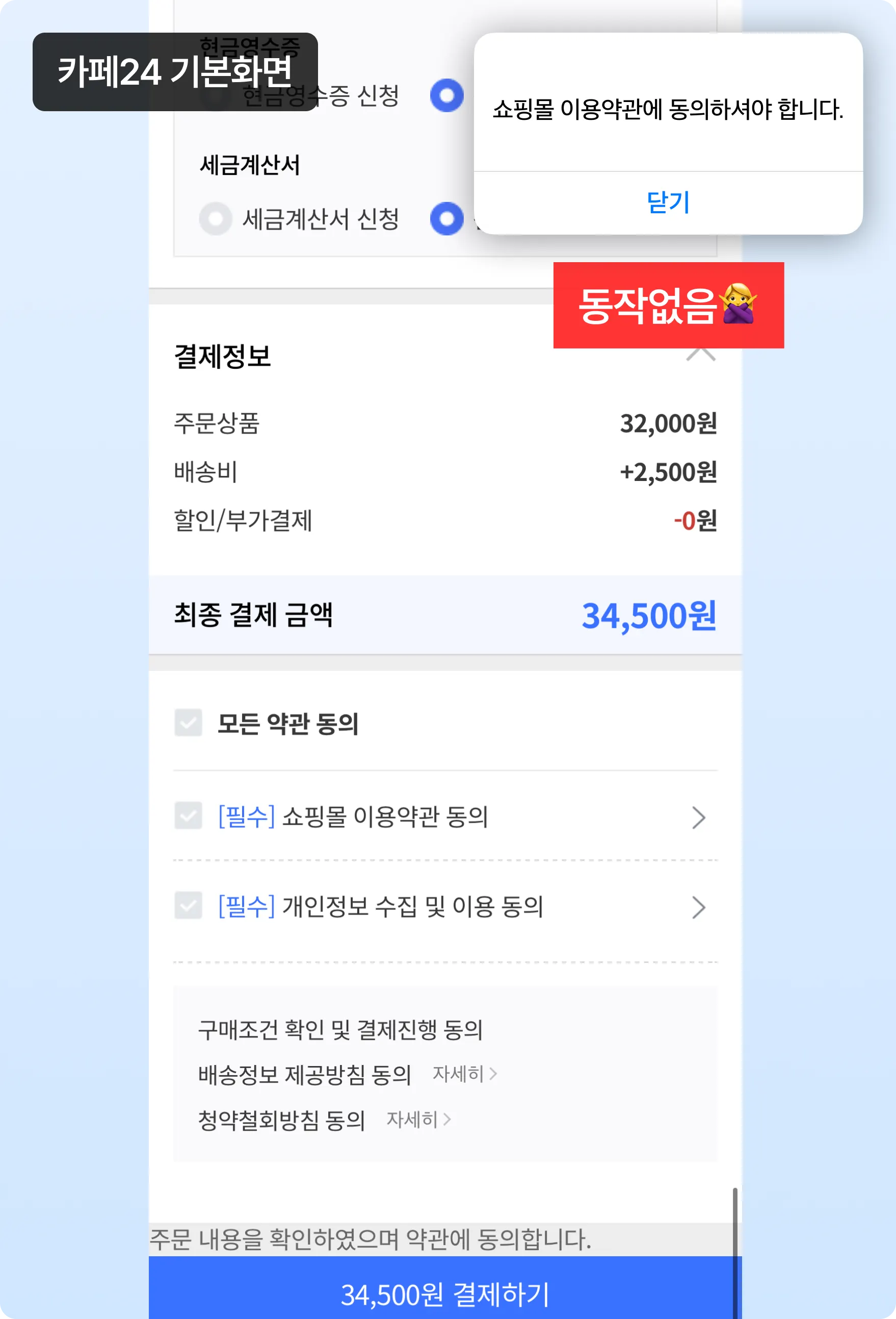 카페 24는 알럿 메시지를 띄운 뒤 닫기를 눌러도 해당 영역으로 이동하지 않아 많은 불편함이 있어요.