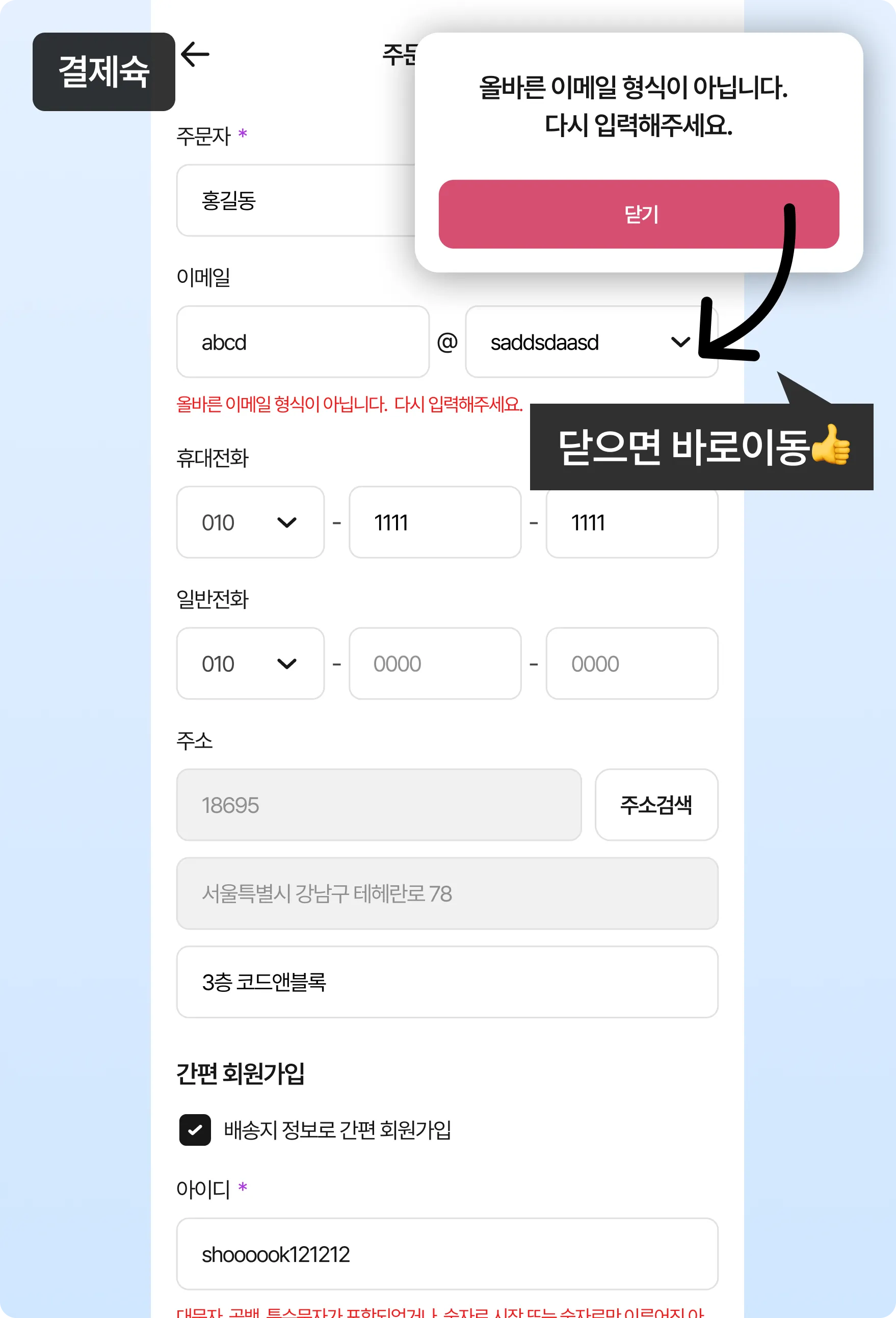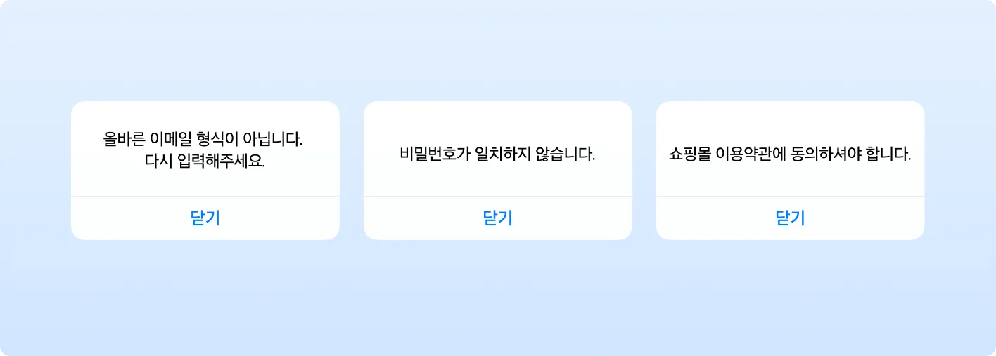 주소 미입력, 올바르지 않은 양식, 미입력된 선택값 다양한 알럿에 대응할 수 있도록 개선했어요.
