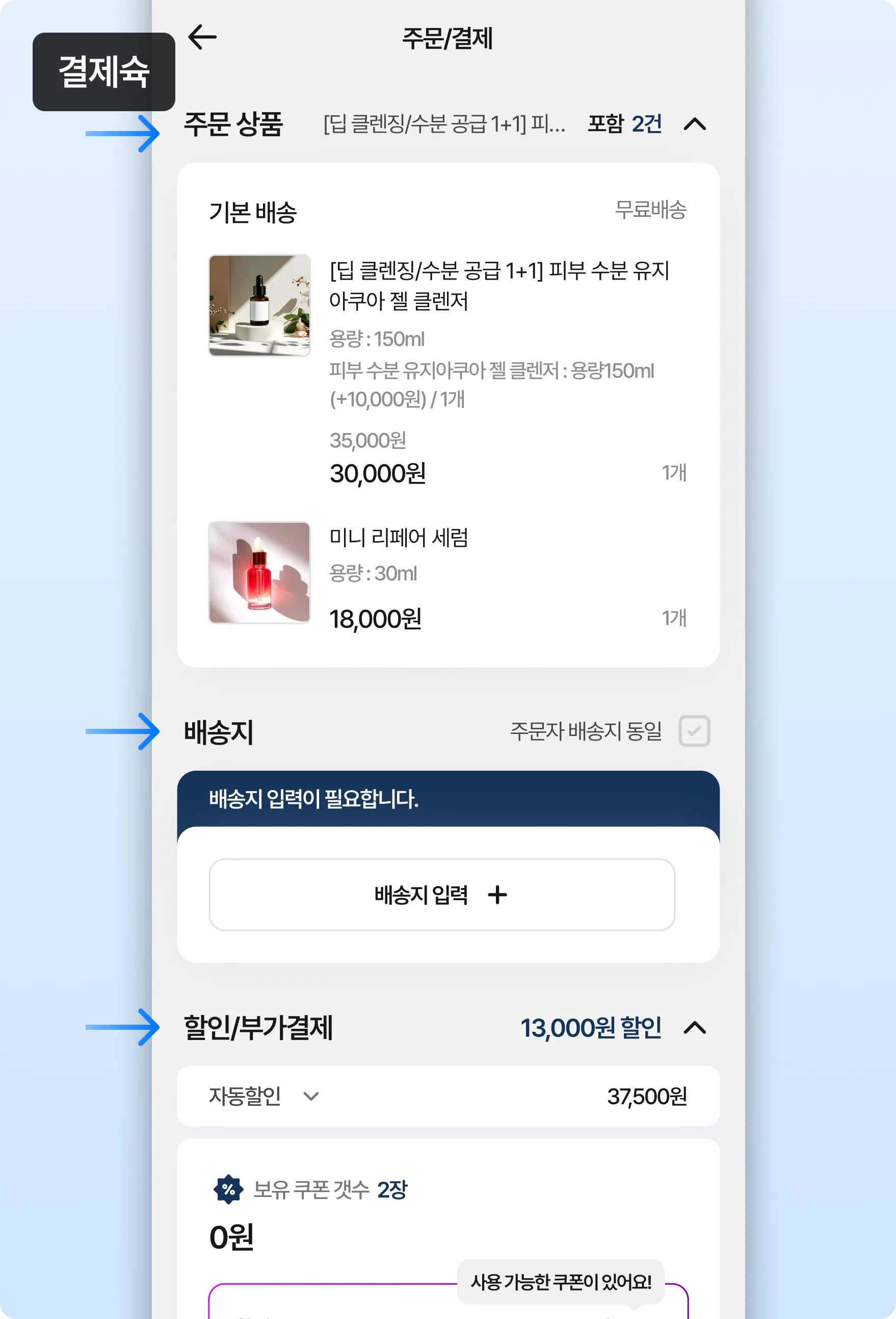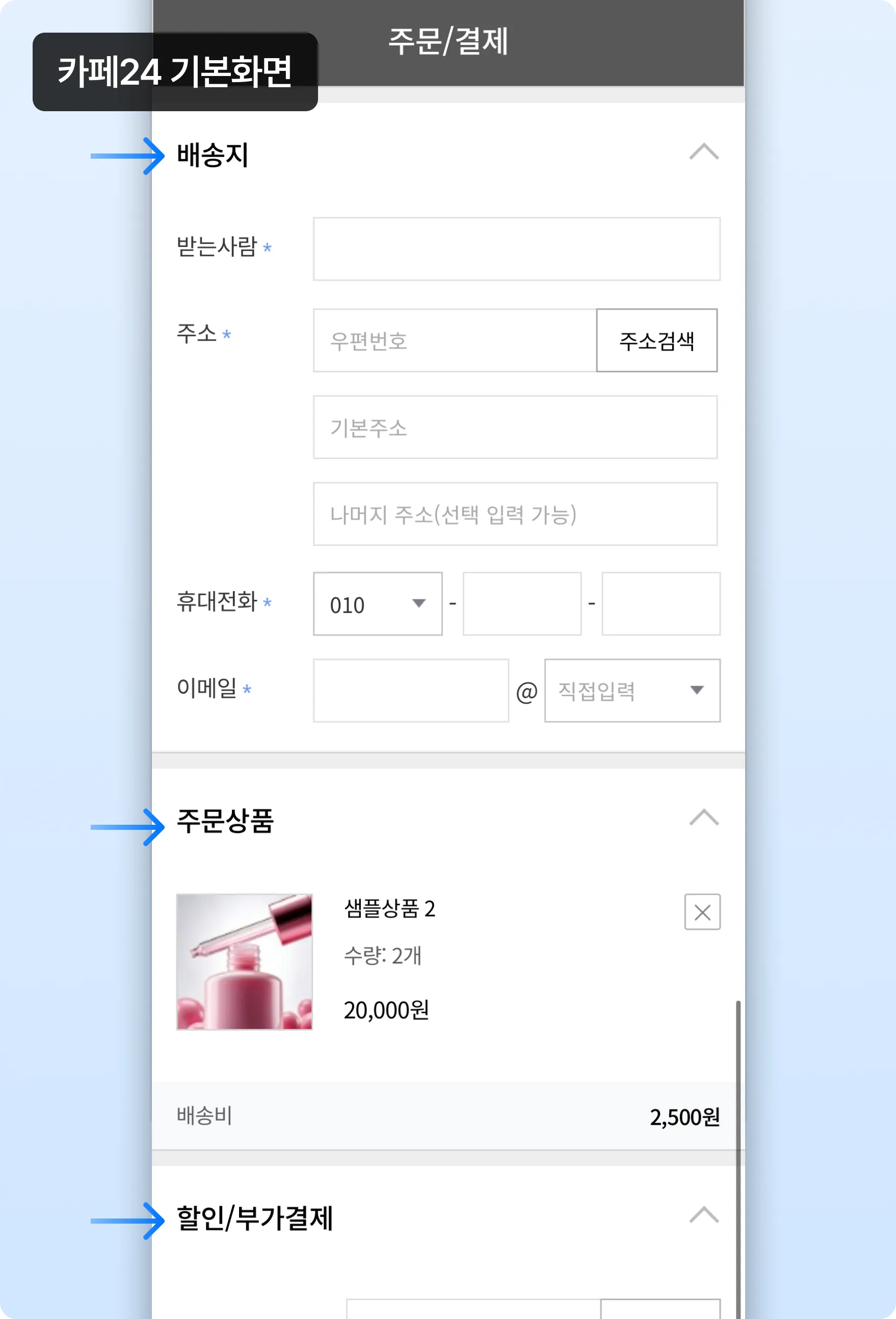 주문자정보-배송지정보-정기배송-희망배송일-주문상품-할인/부가결제-사은품-추가입력-결제수단-적립혜택-결제정보-약관동의-결제버튼
