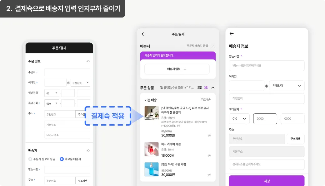 결제슉의 새로운 주문서 화면은 시각적으로 고객이 무엇을 해야할지 명확히 안내합니다. ‘배송지 입력’ 버튼을 통해 배송지 정보 입력 페이지로 이동합니다. 그리고 ‘저장’ 완료 후 다시 주문서 페이지로 돌아갑니다. 이렇게 고객에게 한 번에 하나의 행동만을 요구하며, 항상 “지금 내가 어디에 있는지”를 명확히 인식할 수 있어요.
