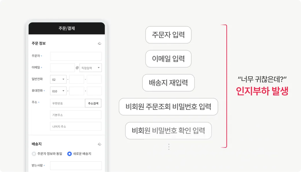 결제 UX에서도 인지부하 현상이 나타날 수 있습니다. 입력란이 많거나, 정보가 과하게 노출되거나, 다음 단계가 모호할 때 고객의 인지 부하가 급격히 증가합니다. 그 결과 “너무 많은데? 다른 앱에서 결제할까?”, “조금 있다 하자”라는 생각이 들면서 결제 완료율은 떨어지게됩니다.