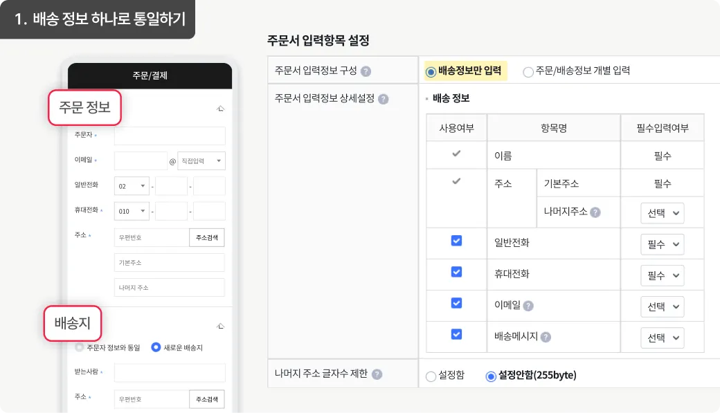 쇼핑몰 설정만으로도 입력 필드를 반이나 줄일 수 있어요. 쇼핑몰 설정 > 주문 설정 > 주문서 입력항목 설정에서 주문/배송정보 개별 입력을 배송 정보만 입력으로 바꿔주세요. 연구에 따르면 입력 필드를 6개에서 3개로 줄이면 전환율이 12% 이상 상승한다고 합니다.