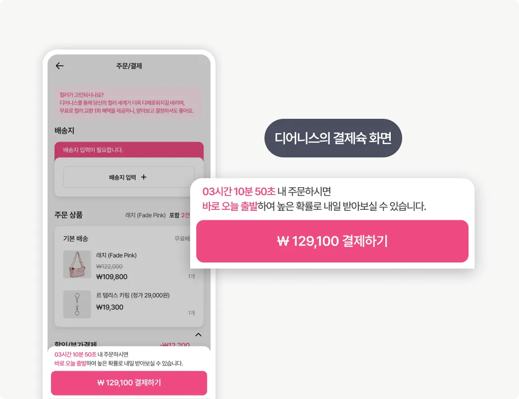 결제슉은 패션 브랜드 디어니스의 CTA(결제 버튼) 상단에 ‘오늘배송 남은 시간’을 직접 표시하는 방식을 적용