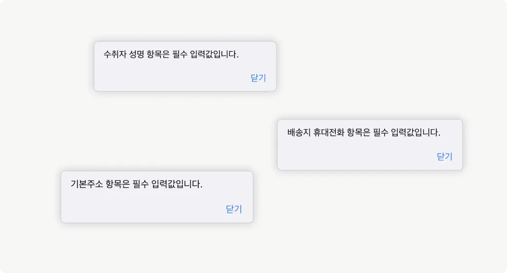 여러 오류를 한 번에 처리 못함: 한 항목씩만 안내되어 “닫기 → 다시 결제 → 또 다른 알럿”의 반복이 생깁니다.