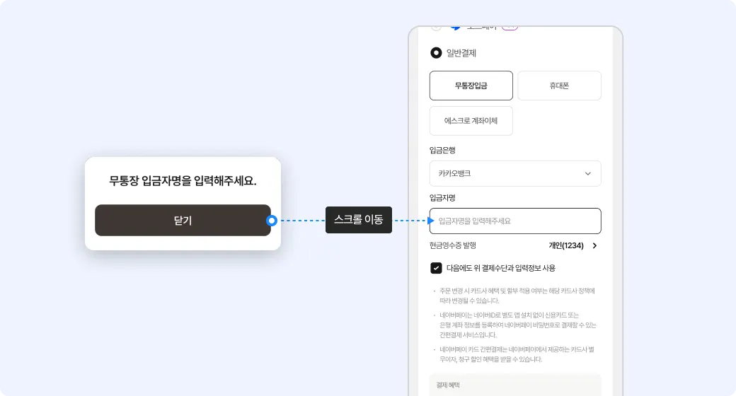 이 구조는 단순히 오류를 빠르게 고치는 편의성을 넘어서, 결제 중단율을 낮추고 전환율을 높이는 실질적인 결과로 이어집니다. 기존처럼 결제 직전 멈춤이 발생하지 않기 때문에, 고객은 결제창에서 더 오래 머무르고, 망설임 없이 ‘결제 완료’ 버튼을 누르게 되죠. 만약 일부 정보가 누락되더라도, 결제슉은 알럿을 닫으면 자동으로 해당 입력란으로 화면을 이동시켜고객이 어디에서 문제가 발생했는지 즉시 확인하고 수정할 수 있도록 돕습니다.