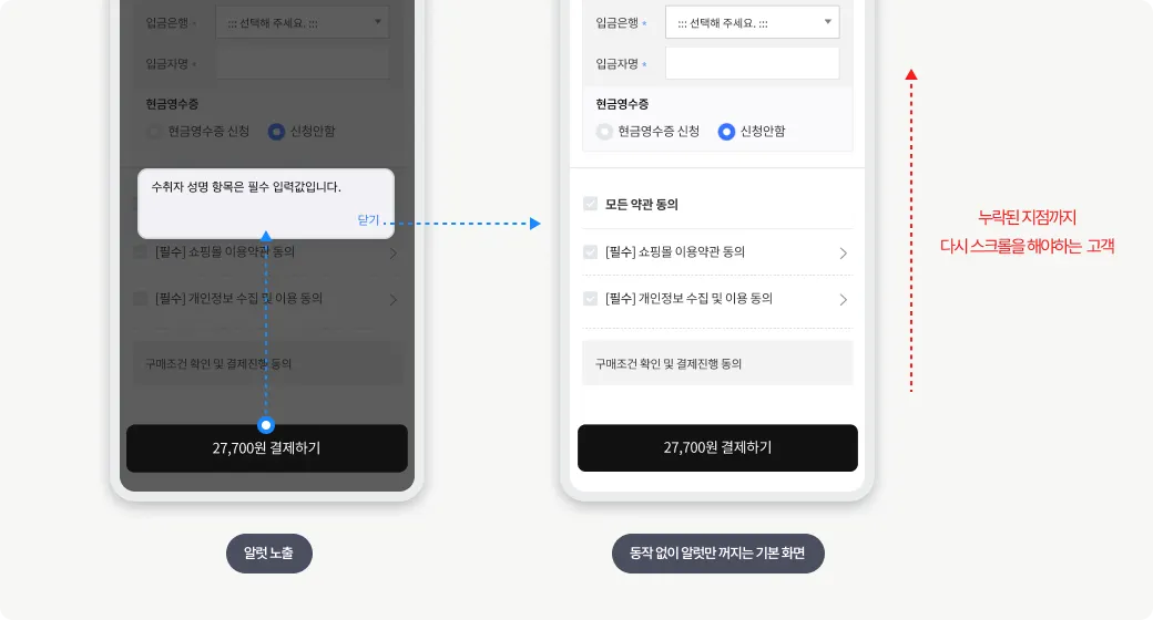 결국 고객은 오류 찾기 → 스크롤 이동 → 재입력을 반복하며 리듬이 깨집니다.