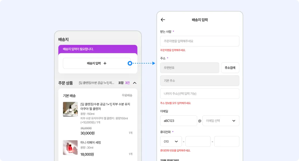 배송지나 연락처를 다 입력하고 ‘결제하기’를 눌렀는데,“이메일 형식이 올바르지 않습니다.” “주소를 입력해주세요.”의 알럿이 나타나 짜증났던 경험 있으신가요? 고객 입장에서는 ‘내가 뭘 잘못했지?’보다는 ‘이걸 또 찾아서 고쳐야 해?’라는 피로감이 먼저 듭니다. 결제의 리듬이 끊기면서 집중이 무너지고 ‘그냥 나중에 해야겠다’는 생각으로 결제창을 닫아버리기도 합니다.