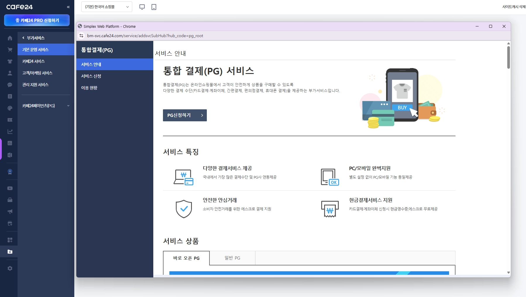 간편 결제는 결제슉 서비스가 아닌 카페24 관리자 내에서 별도의 신청을 통해 이용할 수 있습니다.