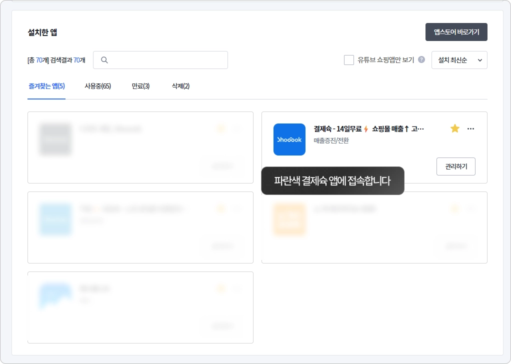 카페24 관리자로 로그인 후 사용중 앱에 접속하여 파란색 결제슉 앱에 접속해주세요.