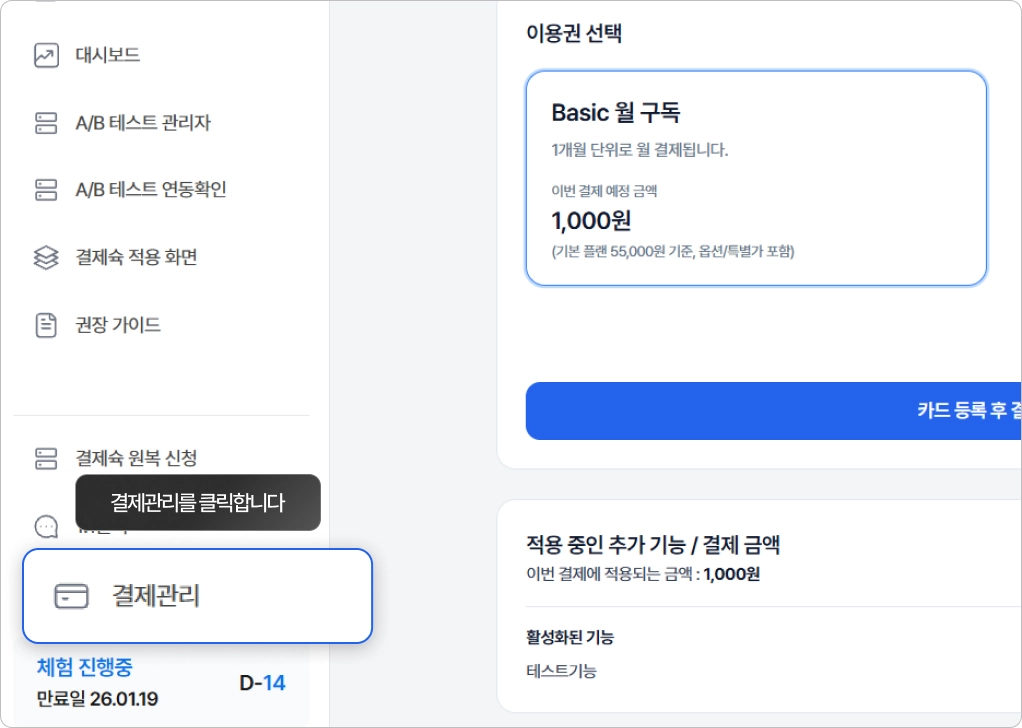 왼쪽 사이드 바에서 “결제관리”에 접속해주세요.