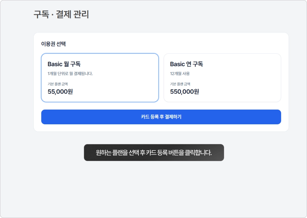 월 구독 또는 연 구독 플랜을 하나 선택하여 카드 등록 버튼을 클릭합니다.