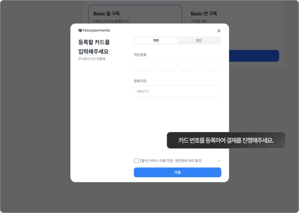 결제 정보를 입력 후 결제를 진행하면 결제슉 구독이 완료됩니다.