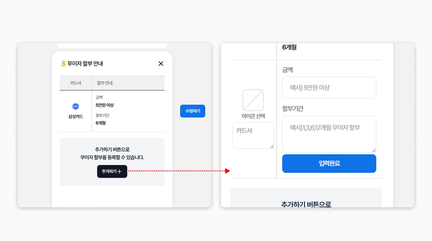 추가하기 버튼을 누르고 카드사 아이콘을 선택한 뒤 금액과 할부기간을 입력합니다.