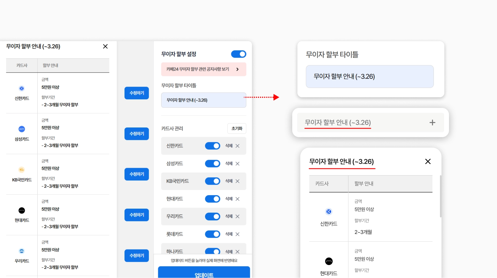 무이자 할부 타이틀을 변경하여 노출되는 버튼의 텍스트도 변경이 가능해요.