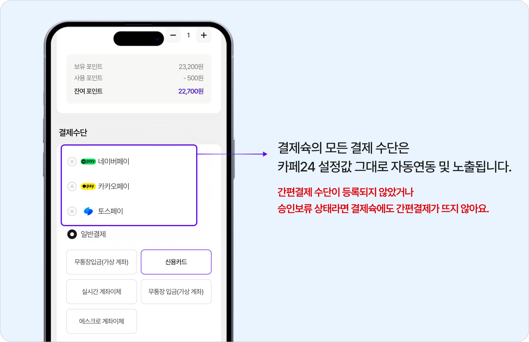 결제슉은 카페24에서 설정이 완료된 결제수단만 자동으로 연동됩니다. 간편결제 수단은 카페24 관리자를 통해서 신청이 가능해요.
