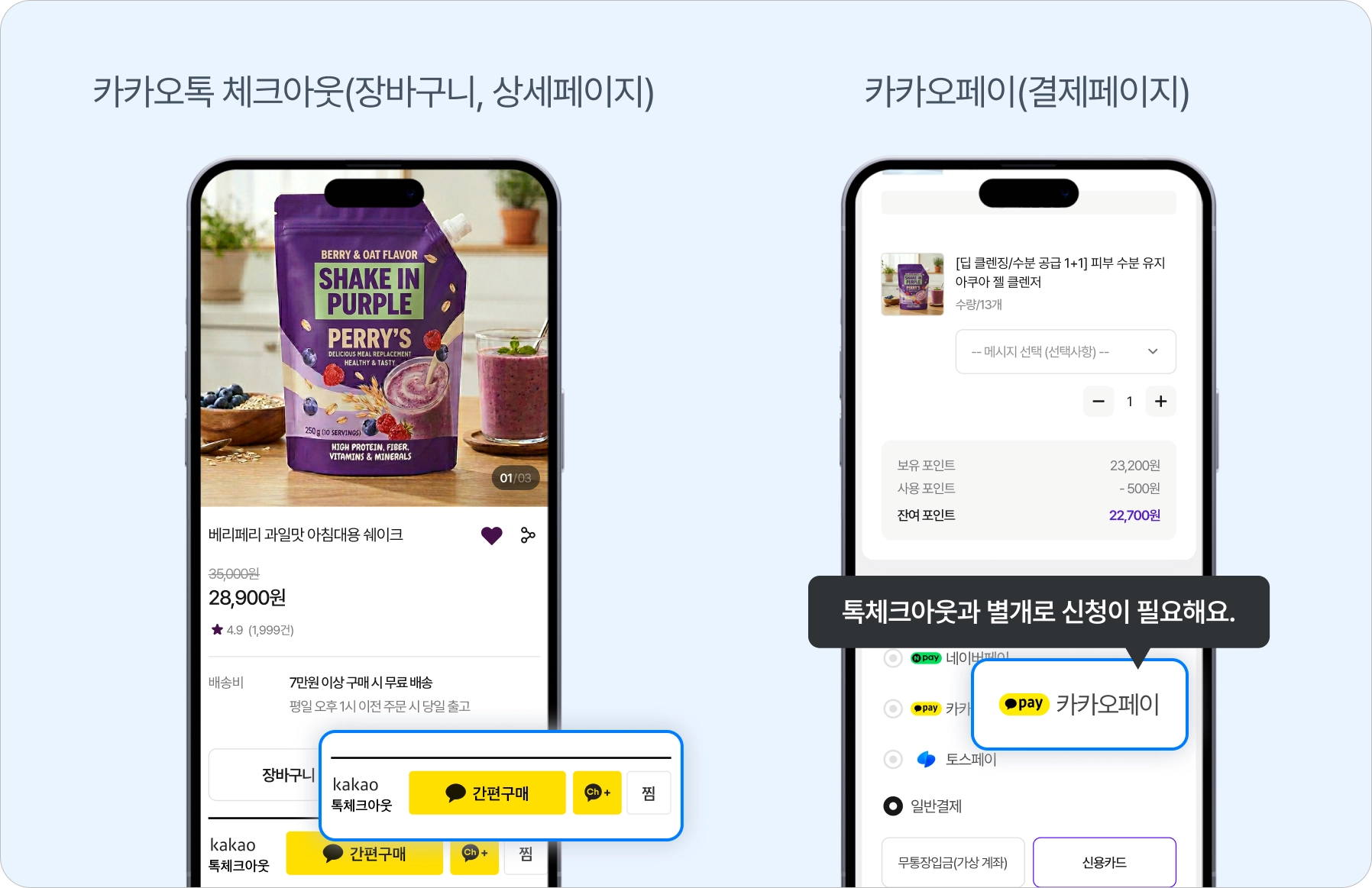 카카오톡 체크아웃: 장바구니, 상세페이지에 노출되는 카카오페이 결제수단입니다.