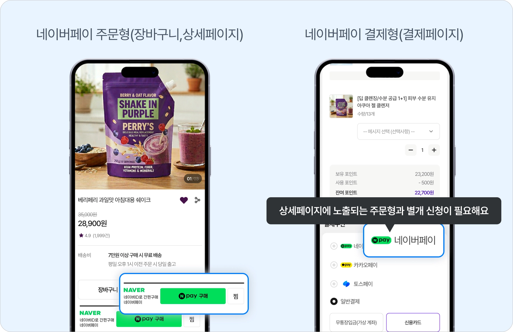 네이버페이 주문형: 장바구니, 상세페이지에 노출되는 네이버페이 결제수단입니다.