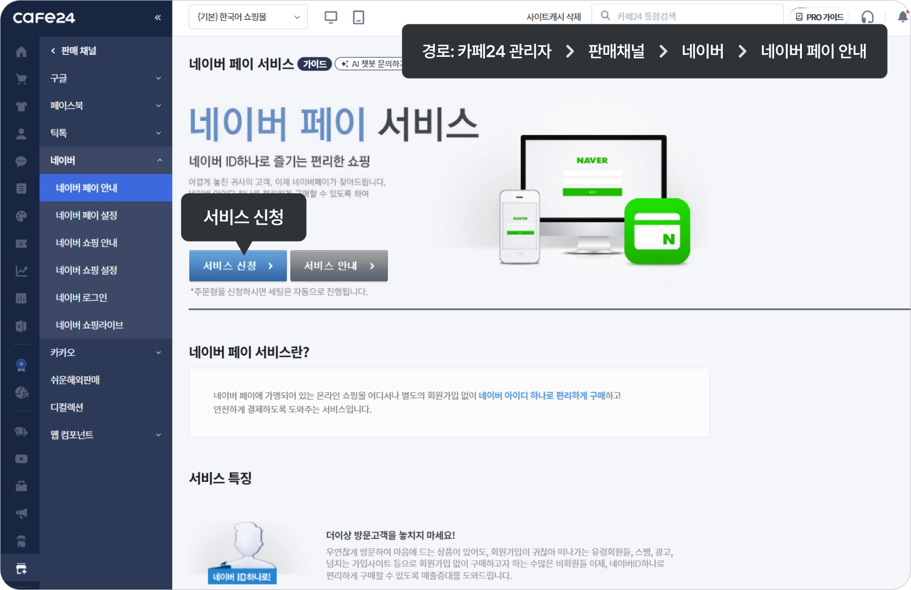 경로: [카페24 관리자 ▷ 판매 채널 ▷ 네이버 ▷ 네이버페이 안내]로 신청해주시기 바랍니다.