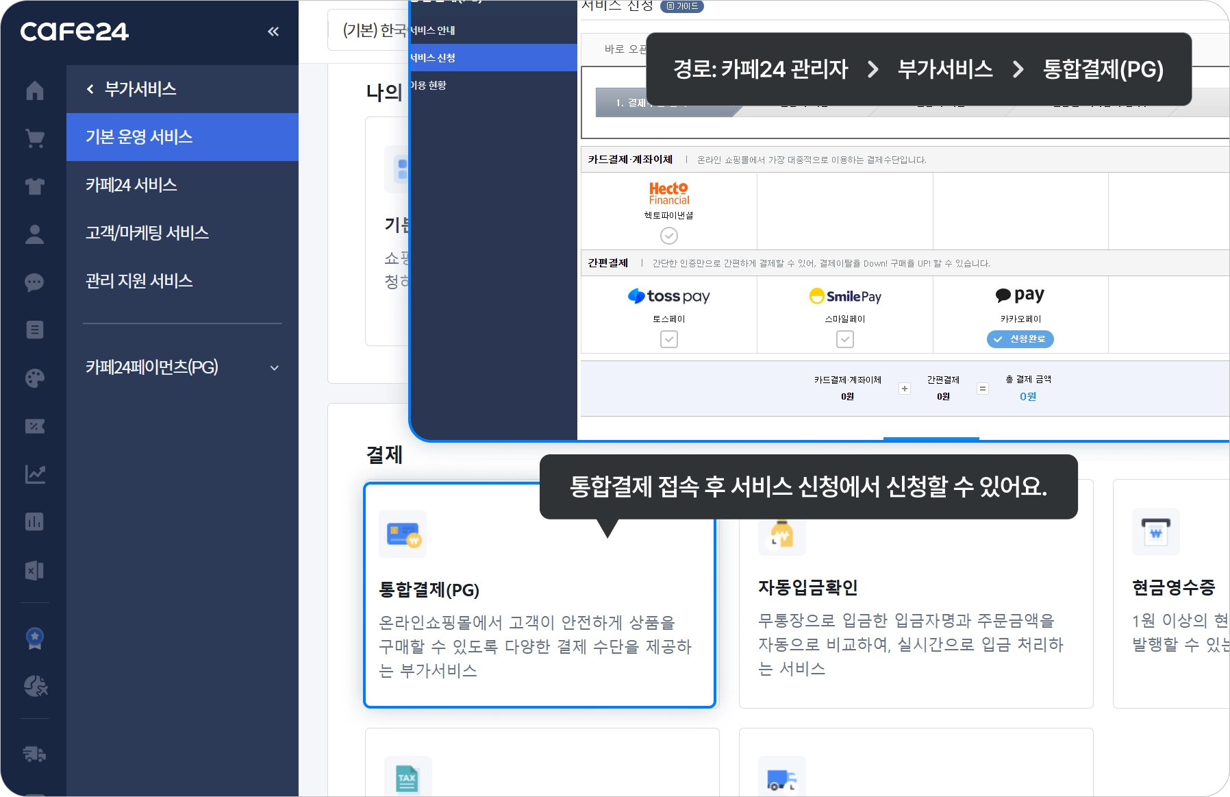 카페24 관리자 ▷ 부가 서비스 ▷ 기분 운영 서비스 ▷ 통합결제(PG) ▷ 서비스 신청