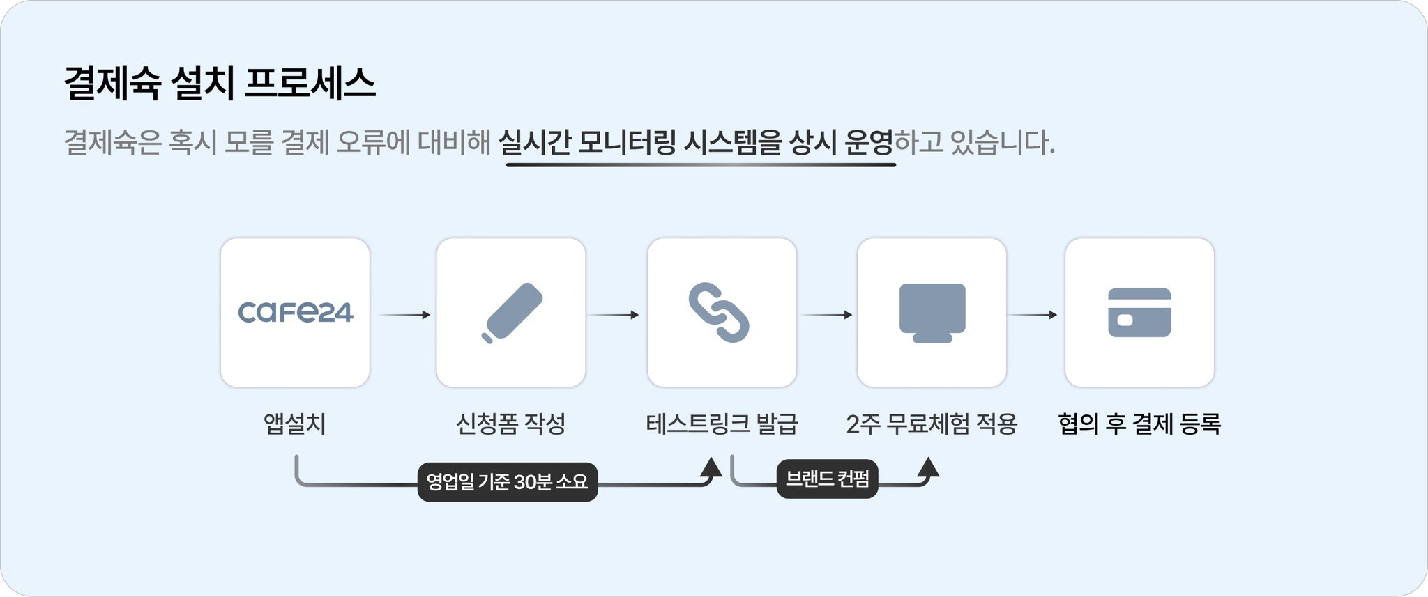 결제슉은 앱 설치 이후 신청폼을 작성하면, 운영팀이 수동으로 설치를 도와드리고 있습니다.