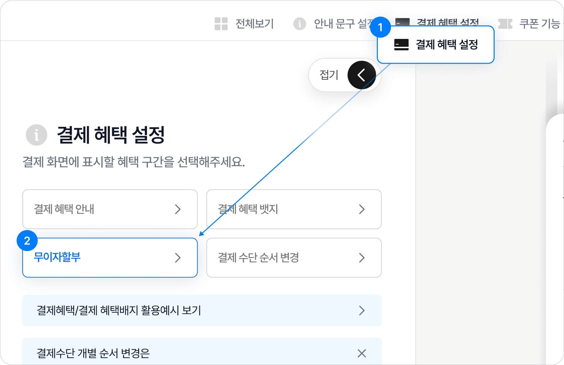 결제슉에 접속한 후 [기능 관리 ▷ 결제 혜택 설정 ▷ 무이자할부]를 차례대로 클릭합니다.