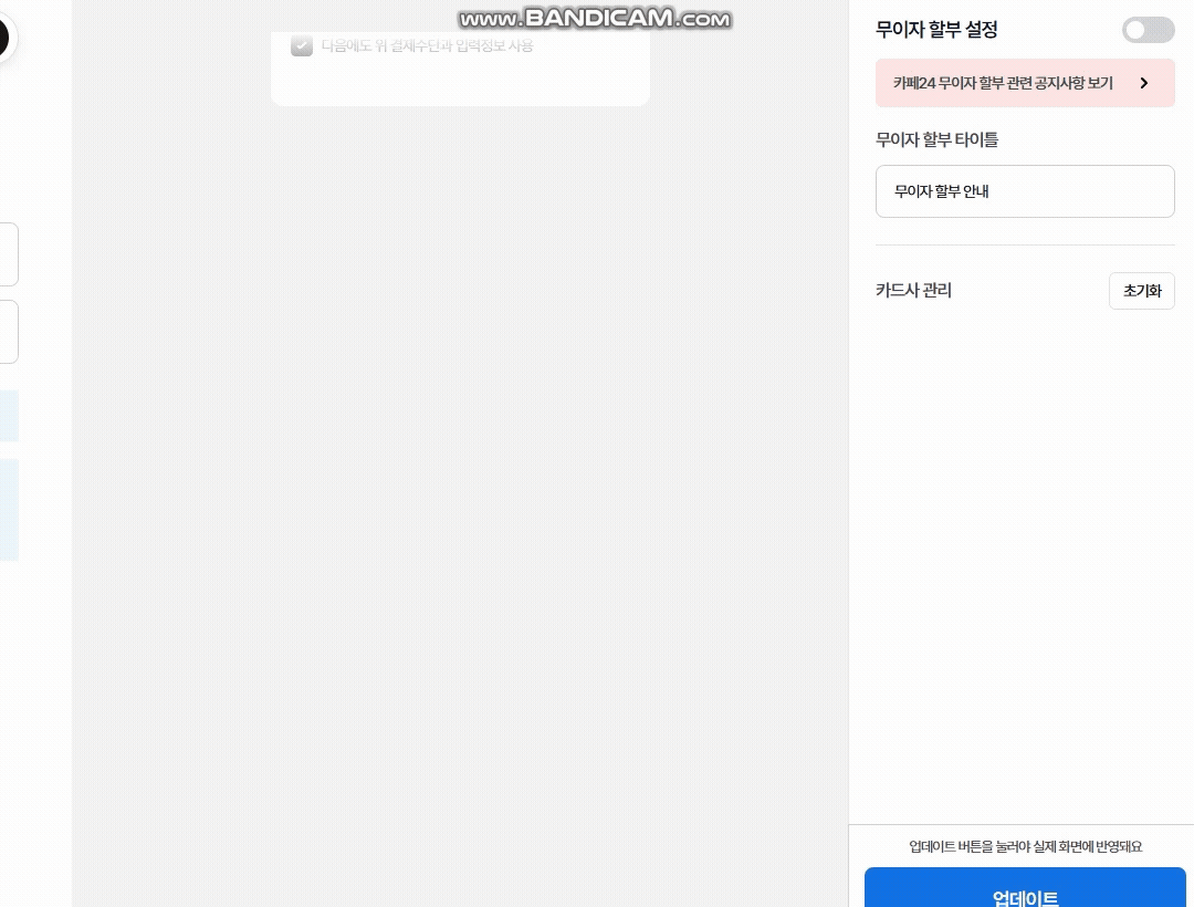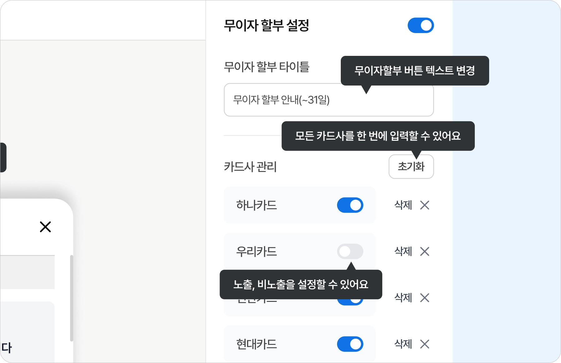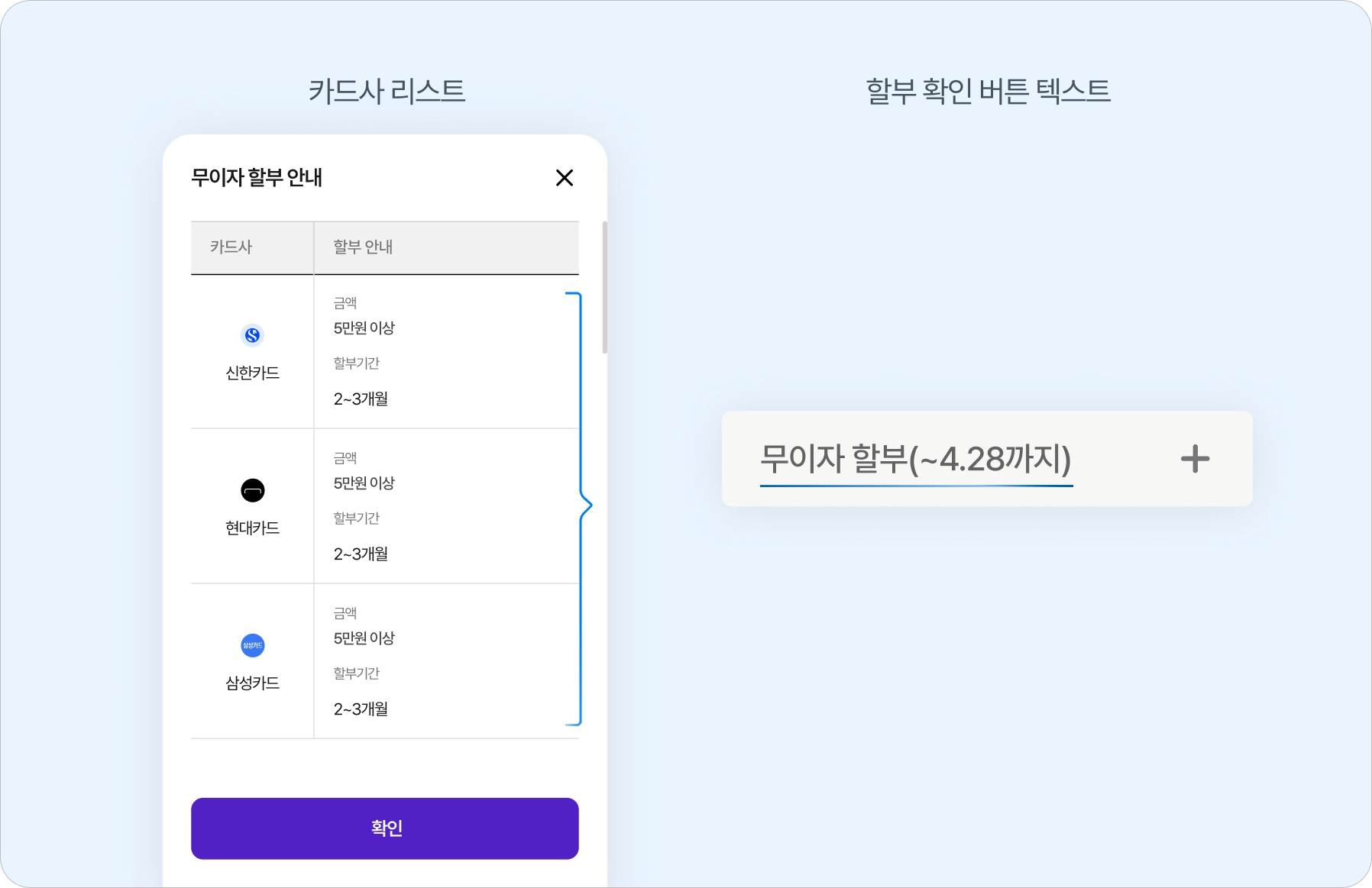 무이자 할부 타이틀: 무이자할부 버튼 텍스트를 변경할 수 있어요.