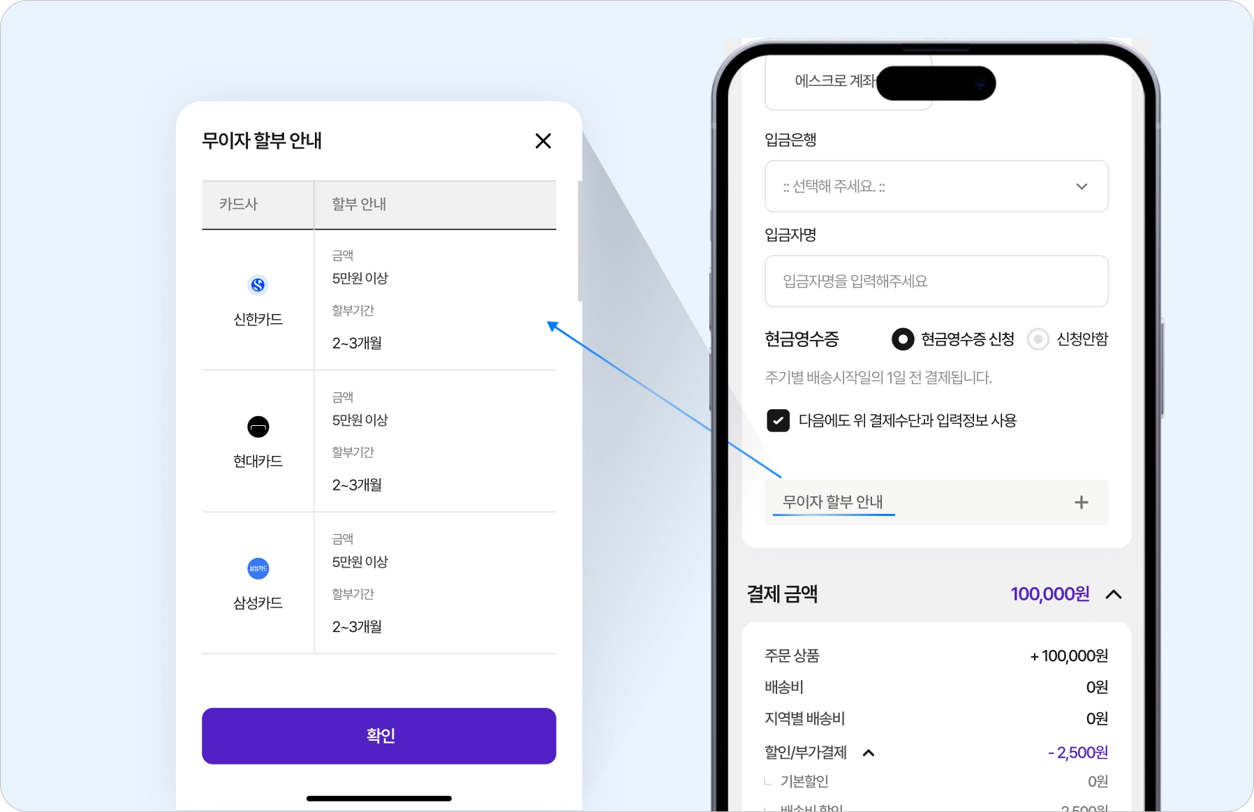 고객의 심리적 부담을 줄여주는 무이자할부 혜택을 결제페이지에서 강조해보세요.