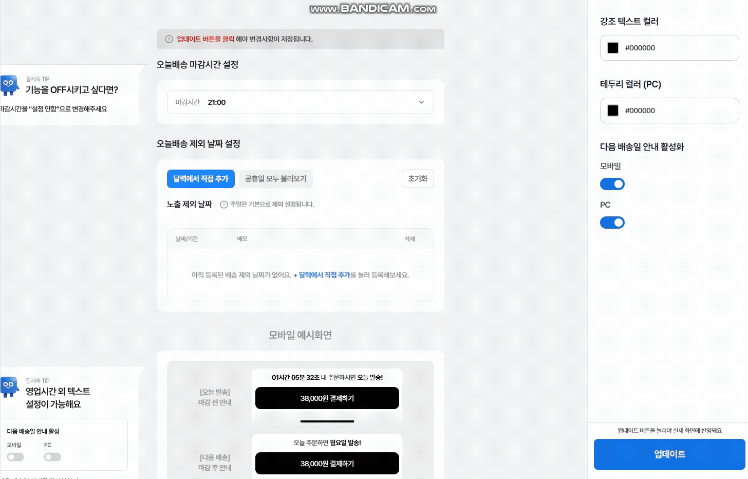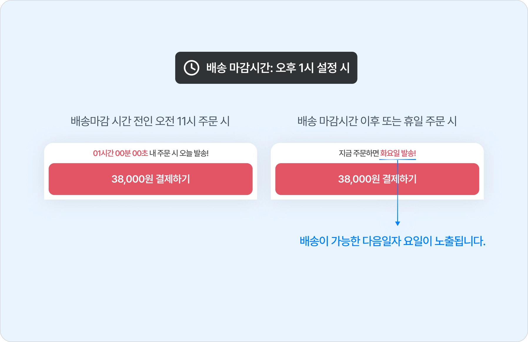 해당 기능을 활성화하면 배송이 가능한 다음요일을 노출 시킬 수 있어요. 해당 기능을 비활성화하면 마감시간 이후 타이머가 노출되지 않아요.