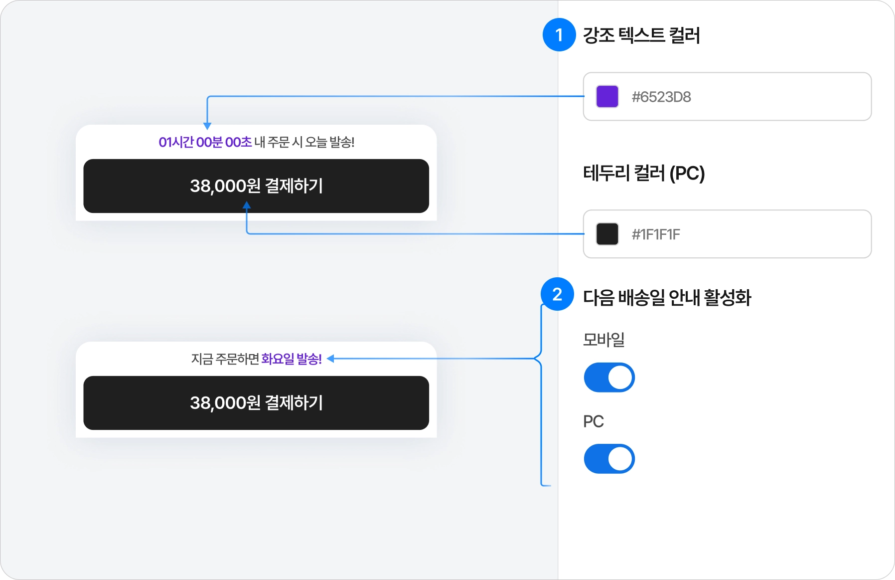 강조 텍스트 컬러는 “01시간 12분 22초”, “OO일 발송”에 해당하는 텍스트의 컬러를 변경할 수 있어요.