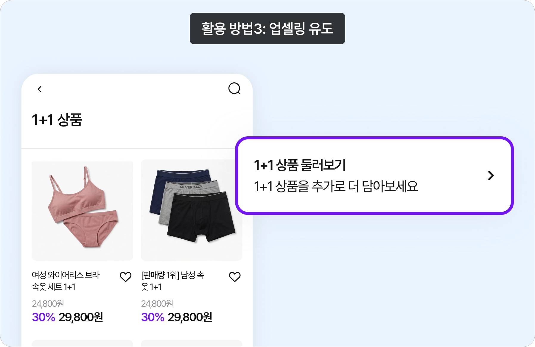 1+1 상품 카테고리, 오늘발송 상품 카테고리 등 업셀링 유도가 가능한 카테고리로 랜딩시켜 객단가를 올려보세요.