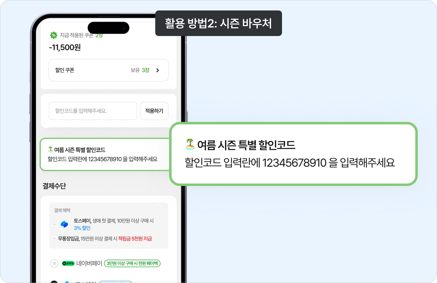 특별 할인코드를 노출시켜 고객의 구매 심리를 자극할 수 있어요.