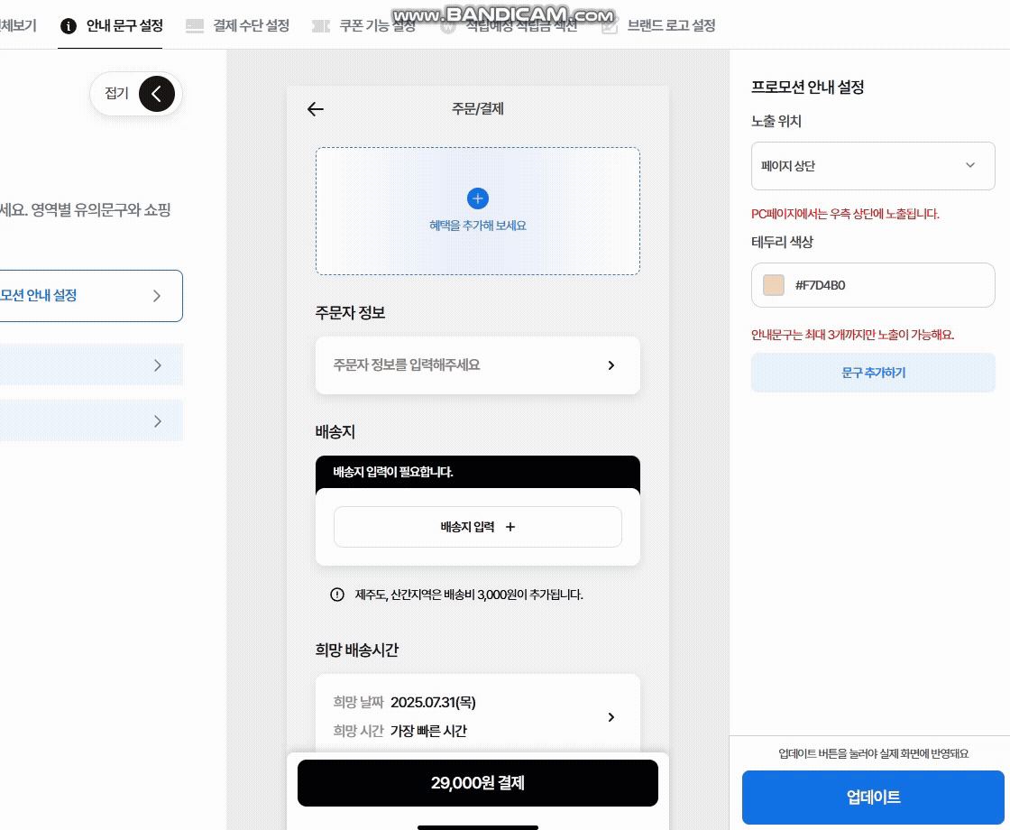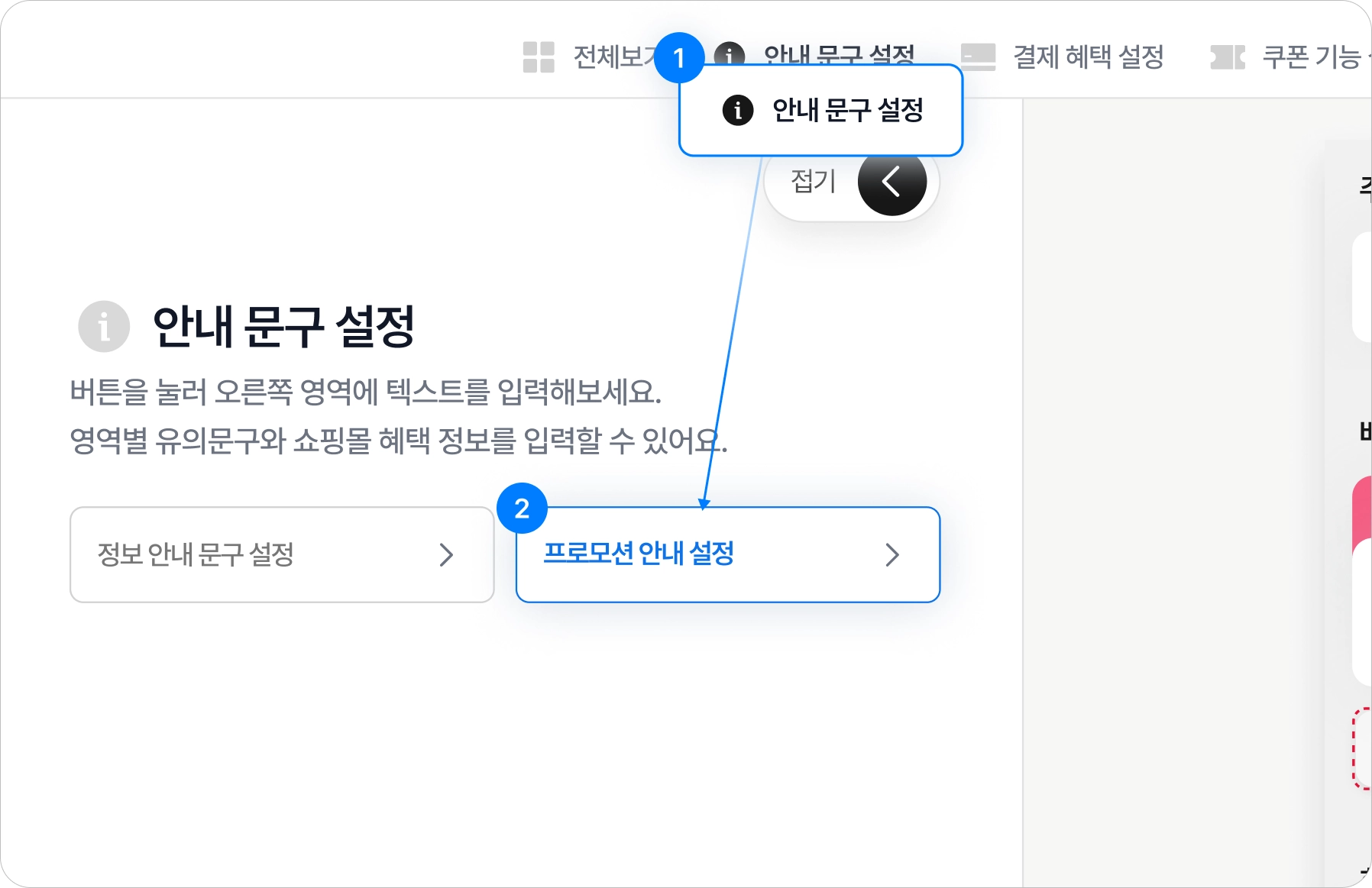 프로모션 안내 설정기능은 최상단과 결제 수단 하단 중 하나의 위치로만 설정이 가능해요.