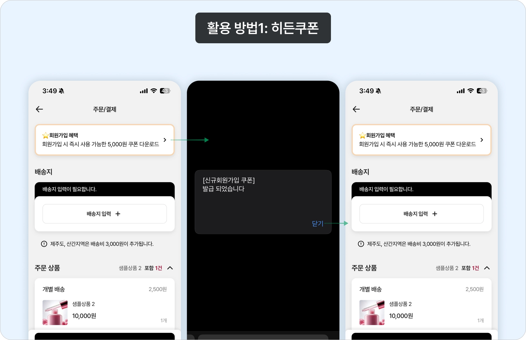 위 사진과 같이 [배너 클릭 ▷ 쿠폰 발급 ▷ 결제페이지 접속] 의 플로우가 완성이 돼요.