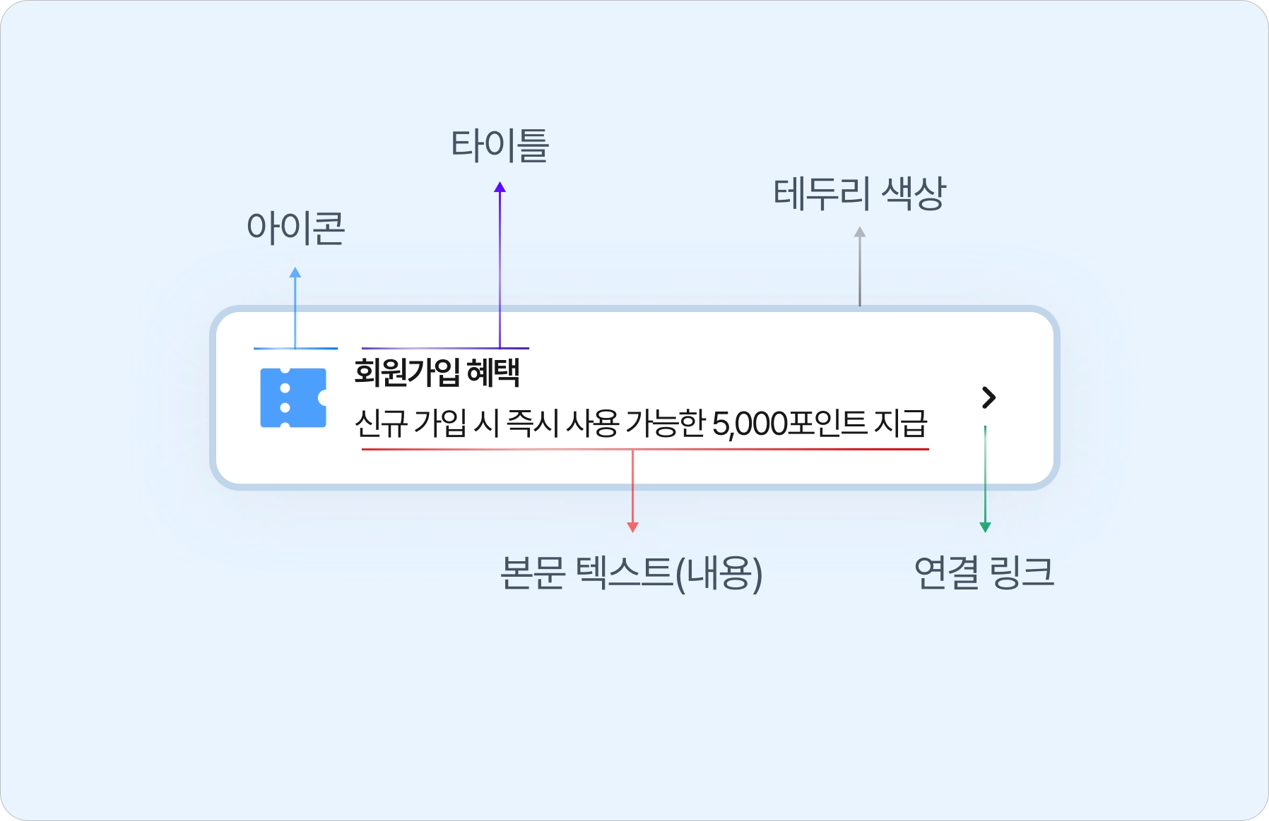 아이콘, 타이틀, 내용, 테두리 색상, 연결 링크를 설정할 수 있어요.